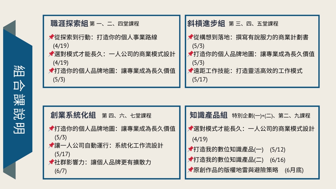 這是一門專為 一人創業者、接案工作者、斜槓者 設計的完整學程,幫助你從 職業探索 到 穩定經營,打造屬於你的理想事業。